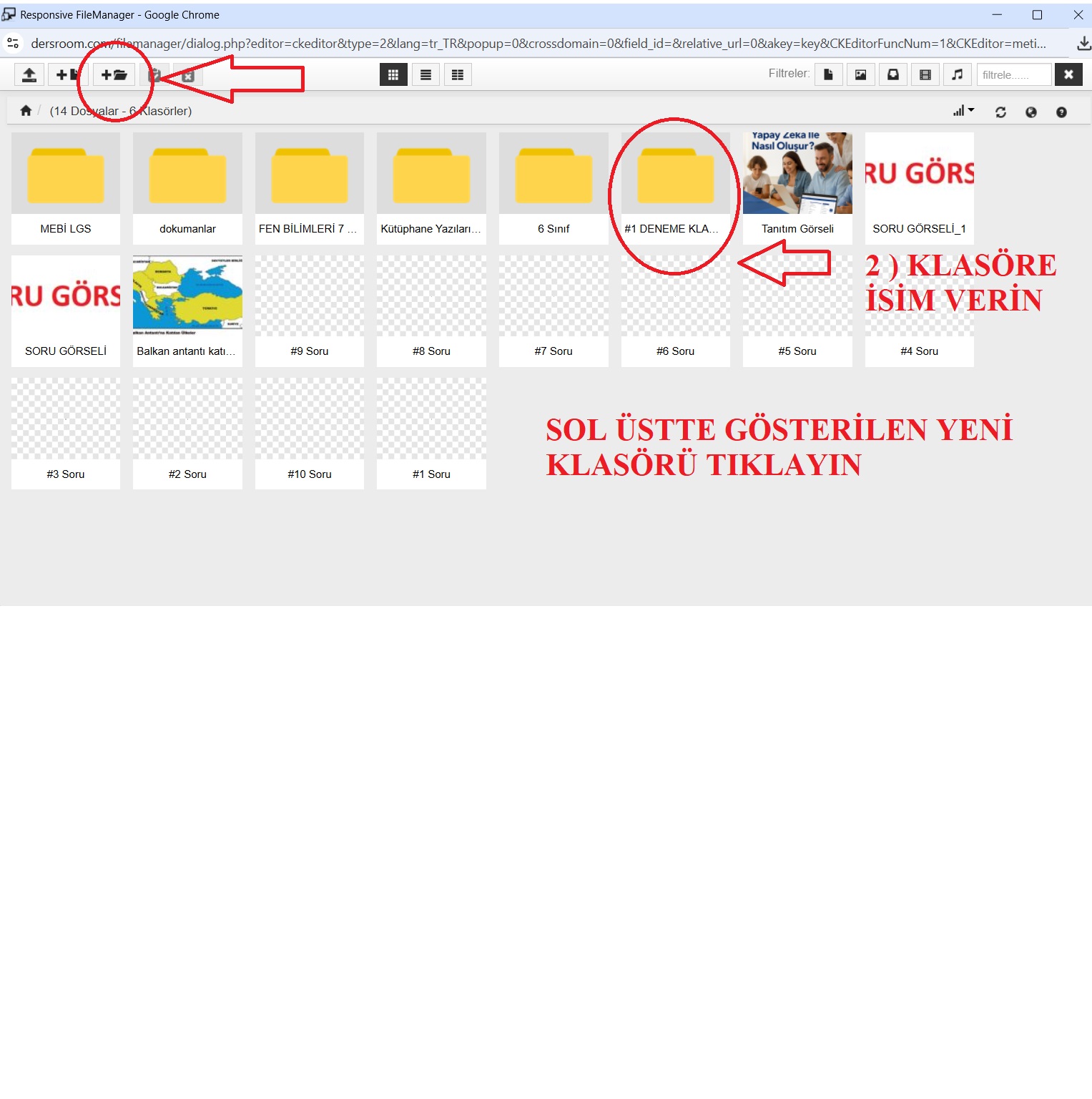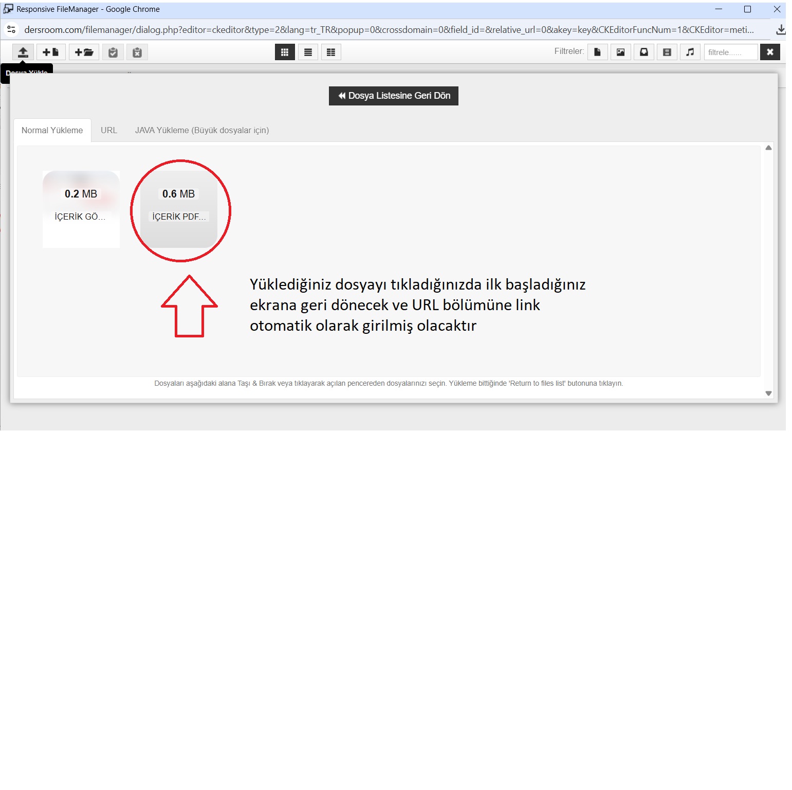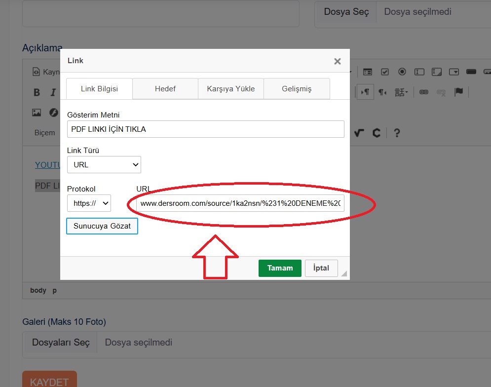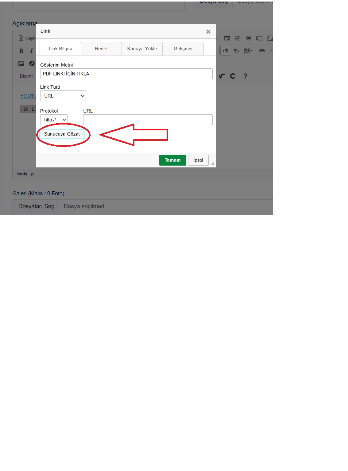 Üst panelden “Link Ekle” butonuna tıklayın. Açılan pencerede: (Görsel 6) a. “Sunucuya göz at” butonuna tıklayın. (Görsel 7) b. Açılan dosya yöneticisinde “Yeni Klasör” butonuna tıklayın. (Görsel 8) c. Klasöre bir isim verin ve "Tamam"a tıklayın. Klasörünüz oluşturulacaktır. (Görsel 8) d. Oluşturulan klasörün içine girin. (İsterseniz burada da alt klasörler oluşturabilirsiniz). e. Dosya yüklemek için “Dosya Yükle” butonuna tıklayın. (Görsel 9) f. Sürükle-bırak yöntemi ile bilgisayarınızdaki PDF veya belgeyi yükleyin. (Görsel 9) g. Yüklenen dosyanın üzerine tıklayın. Sistem sizi otomatik olarak ilk link ekleme ekranına geri döndürecek ve dosyanın linkini URL bölümüne otomatik olarak yazacaktır. (Görsel 10 ve Görsel 11)