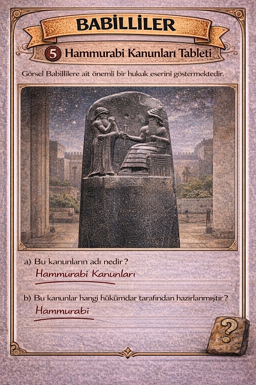 Babilliler, Mezopotamya’da kurulan ve özellikle Hammurabi Kanunları ile tanınan önemli bir uygarlıktır. 5. sınıf Sosyal Bilgiler dersinde öğrencilerin öğrenmesi gereken temel konulardan biri olan Babilliler ve Mezopotamya uygarlıkları için hazırlanan bu içerik, öğrencilerin konuyu daha kolay anlamasına yardımcı olur.